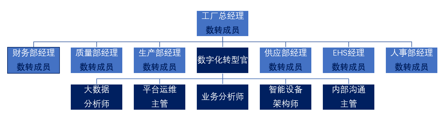 ROLE数字化转型官”。设定这个岗位的目的是:“领导组织实施数字化转型战略”。这个岗位的使命是:“推动文化变革,构建数字化能力,以提供创新的商业模式和流程。根据企业自身组织架构、规模、文化、现有人员能力,可以设立数字化转型官,或再增设数字化转型领导小组,此处展示一家数字化转型中的智能工厂,借鉴他们在数转中重组的组织架构。